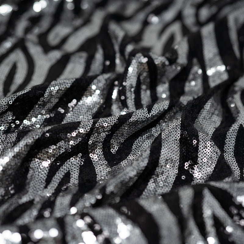 Zebra Glitz is a 4-way stretch Polyester Spandex with Embroidered Sequin. It's a lightweight and modern fabric perfect for any party dress or costume, providing both comfort and durability. This fabric stands up to wear and tear, so you can be sure your creations will last as long as the memories they make. With a dazzling display of sequins, it's a fabric that provides exactly the right amount of sparkle. The sequins are designed to catch the light, giving off a unique and unmistakable brilliance that looks great onstage or on a night out. Zebra Glitz is the perfect fabric for creating garments that dazzle and delight.